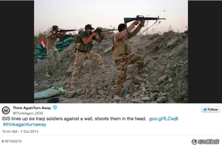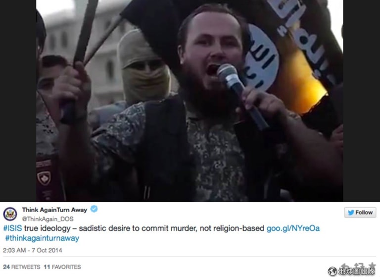 因此,美國在對付 ISIS 上有兩個層面,一是空襲的軍事方面,另一個則是社群網路戰, 所以美國國務院開始建立推特帳戶,由反恐戰略傳播中心管理,帳戶名稱為「Think Again Turn Away」,希望能對 ISIS 這樣的媒體有所打擊。