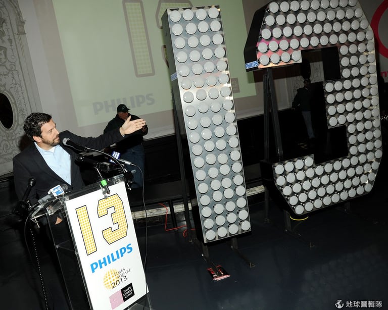 時代廣場聯盟(Times Square Alliance)的主席提姆(Tim Tompkins)正在跟大家介紹倒數數字!看來是飛利浦贊助的喔! 圖片來源:Ben Gabbe/Getty Images