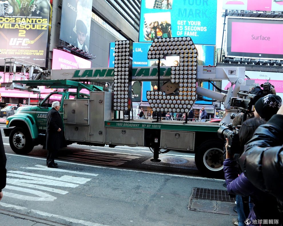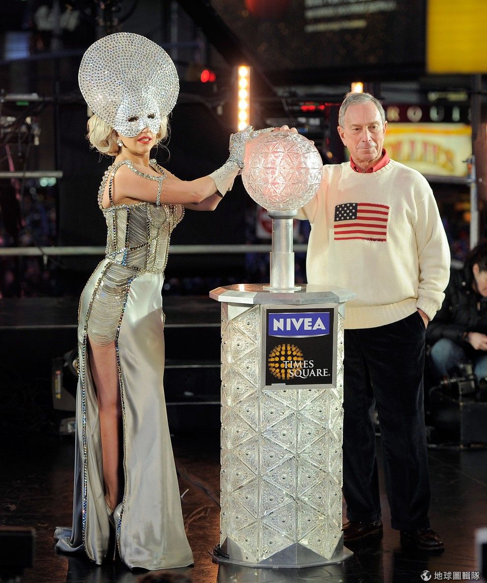 去年迎接2012年時,紐約市長邀請了Lady GaGa按下水晶燈按鈕,這顆象徵紐約大蘋果的水晶燈,將會在跨入2013年的瞬間,從43公尺的高空緩緩降下!圖片來源:Jemal Countess/Getty Images