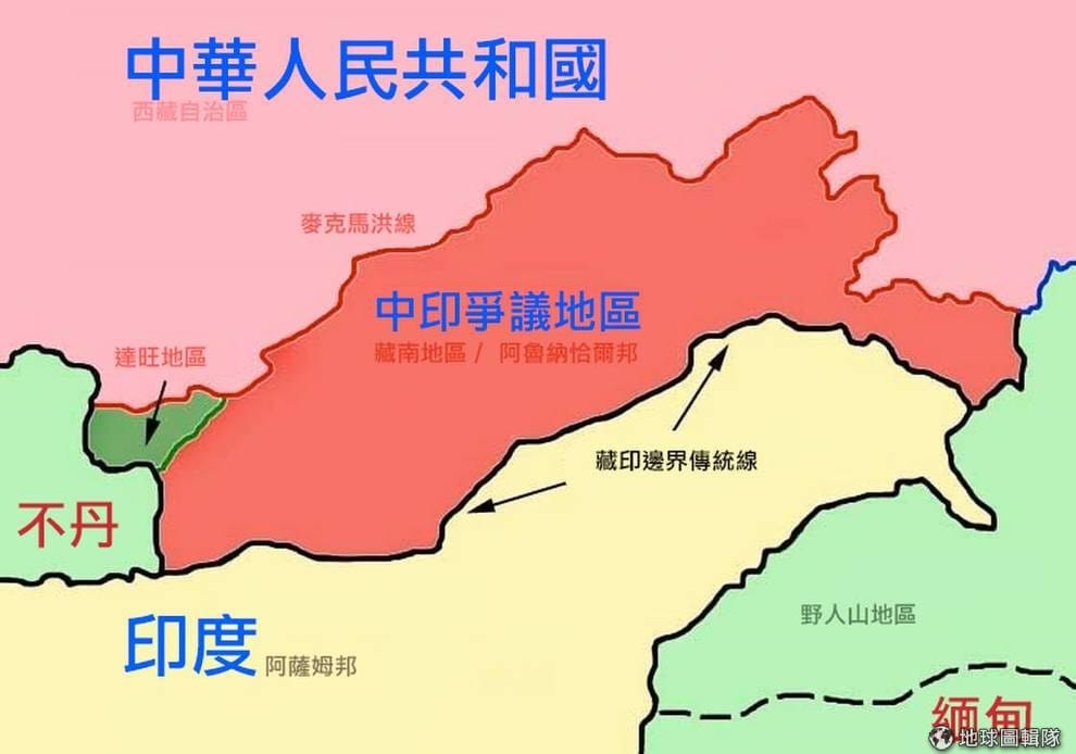 照片中箭頭所指的達旺地區,是西藏流亡政府的所在地。這是中國與印度邊界爭議中一部分,目前由印度治理,落於阿魯納恰爾邦州的行政區劃。五世達賴喇嘛羅桑嘉措樹立的達旺寺就位於此處,是熱門的觀光勝地。Photo credit: wikicommons 編輯:地球圖輯隊