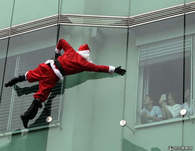 特種警察打扮成聖誕老人的樣子,從小兒科診所的屋頂懸吊下來對屋裡的人打招呼。