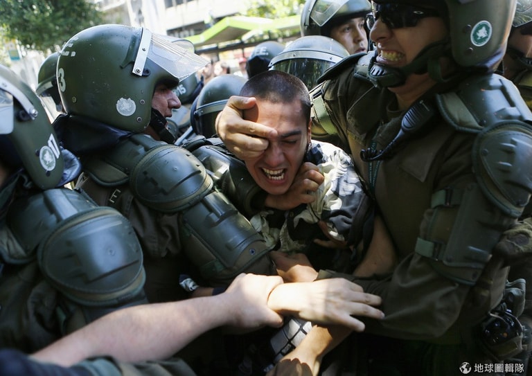 聖地牙哥的教育部旁,一名抗議學生遭到逮捕,日前18號時,聖地牙哥出現抗議大學調漲學費的學生。