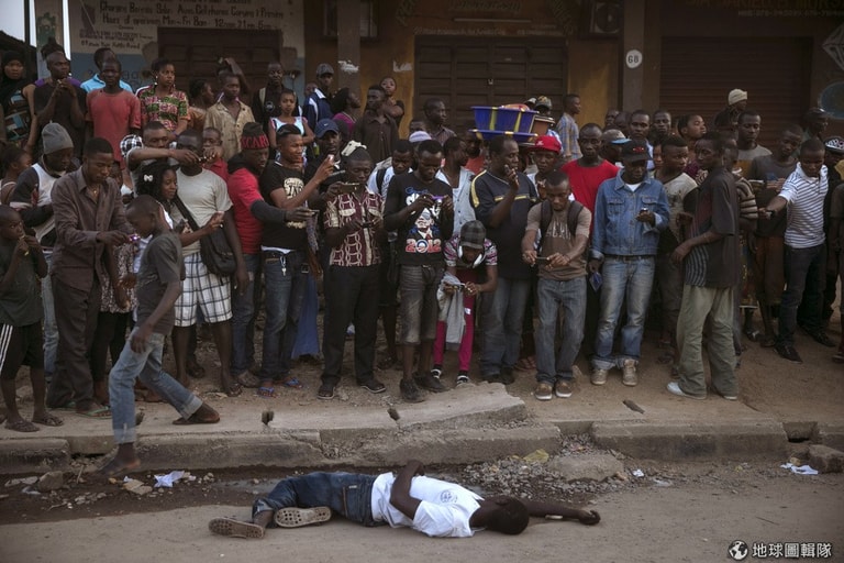 獅子山的科諾區(Kono),人們擠在街道旁看著眼前的屍體,這名已經沒有生命跡象的男子疑似帶有伊波拉病毒,讓民眾不敢靠近。伊波拉疫情在獅子山當地持續延燒當地的18,603起疑似病例中,有一半以上都是確診病例。