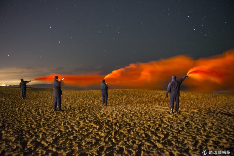 海岸巡邏員站在海岸旁,一同練習燃燒彈打信號的訓練。
