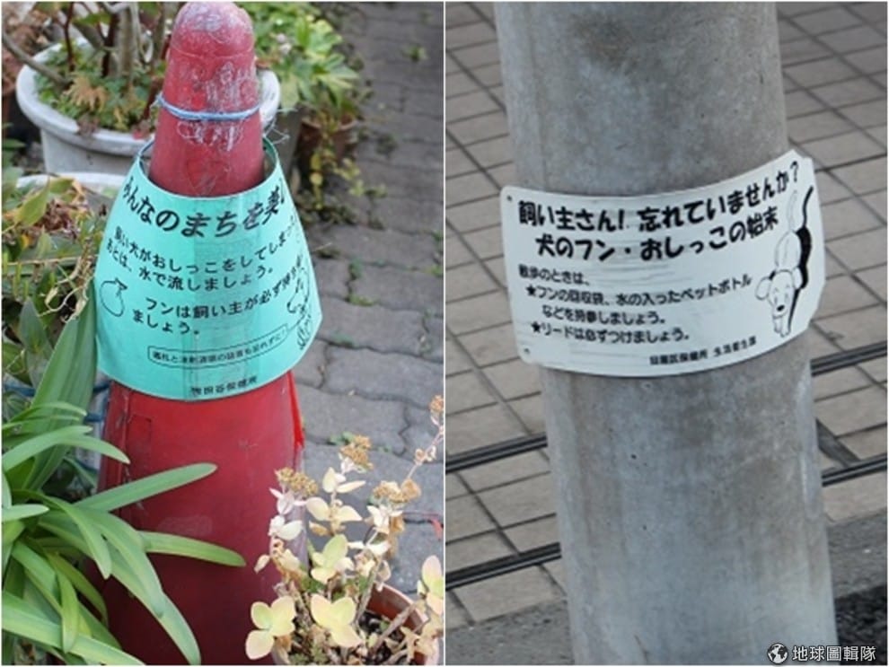 合作夥伴東京住家前、電線桿上都有保健所及生活衛生課的叮嚀,隨時隨地做好飼主教育。左圖叮嚀飼主在狗狗小便後記得沖水、並且要帶狗牌、右圖提醒飼主遛狗時要帶塑膠袋跟水。 何宜/攝