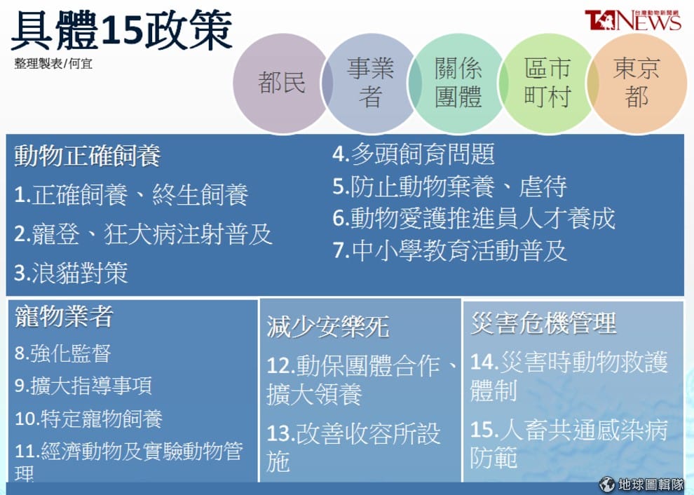 而這15項政策主要分為4大部分:飼主教育、寵物業者管理、降低安樂死及災害危機處理。細節可以看下圖,其中多了與寵物業者合作的部分: