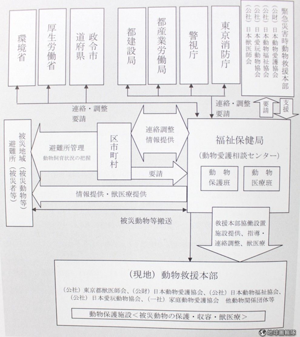 做事嚴謹仔細的日本人,災害時動物的應變聯絡管道計畫的清清楚楚。 翻攝自東京都動物愛護管理推進計畫手冊