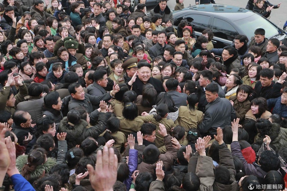 北韓領導人金正恩要巡視平壤的紡織工廠,受到激動歡呼的工廠人員們包圍。