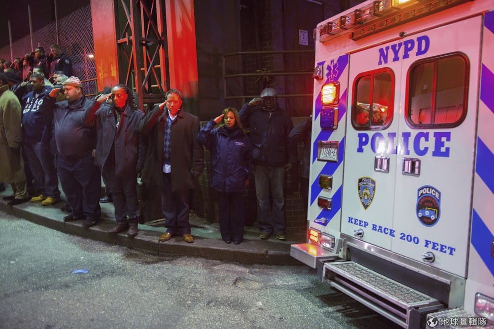 紐約警察向開過街頭的救護車敬禮,這輛救護車上載有2名已經不幸喪生的警察。日前20號時,美國布魯克林區傳出槍響,一名男子持槍射殺2名警察,之後也開槍自盡,當地社群媒體上就傳出這起悲劇與日前紐約警方掐死手無寸鐵黑人的事件相關。