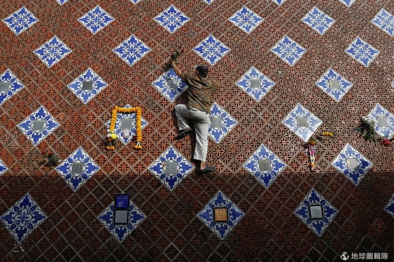 照片中的男子爬上弧形的紀念碑,他要把花束放到亡妻的名字旁。他的太太在10年前的南亞海嘯中不幸喪生。