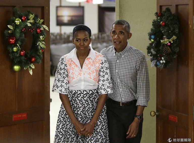 照片中美國總統歐巴馬以及第一夫人蜜雪兒抵達夏威夷軍事基地,他們在26號這天要訪視當地的海軍人員。