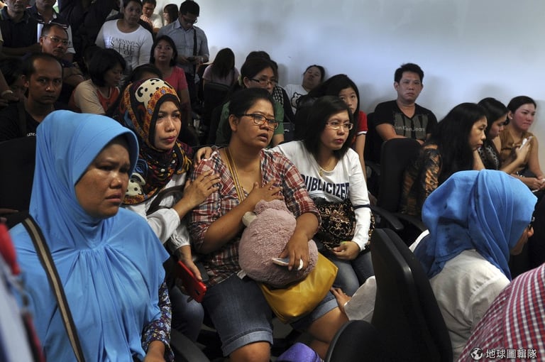 失蹤班機乘客家屬臉上擔憂知情藏不住,紛紛聚集在機場設立的應變中心關注最新消息。