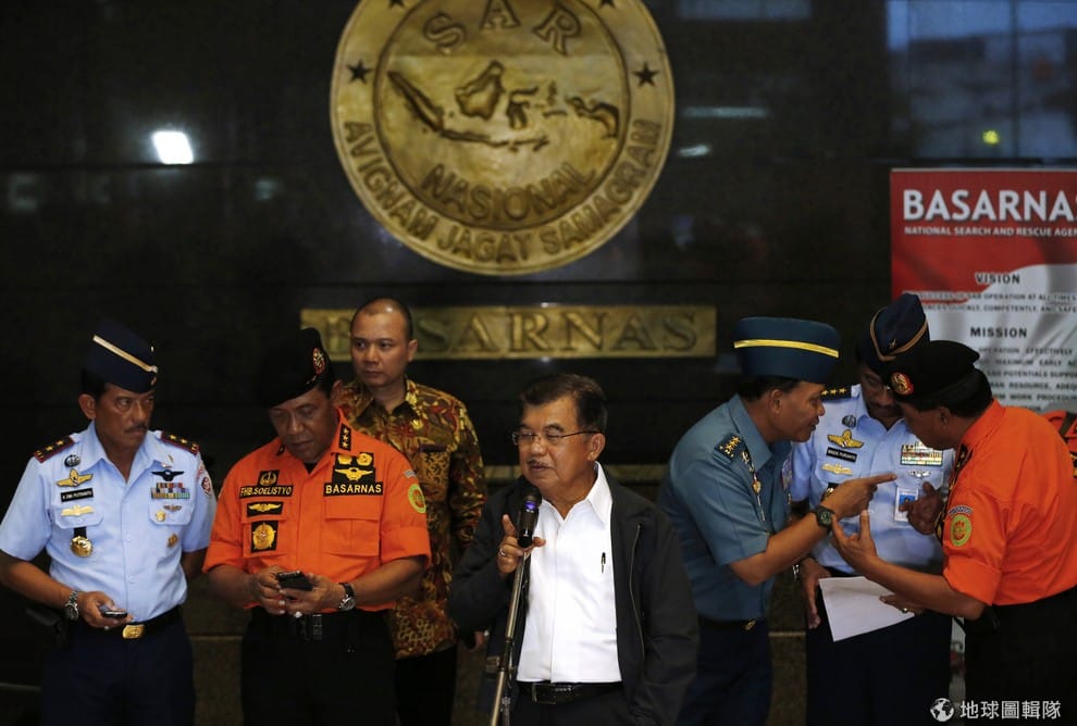 印尼官方立即組織搜救小組,期望透過陸海空合作掌握失蹤班機最新資訊。圖中白衣者為印尼副總統卡拉(Jusuf Kalla)正對媒體發表最新搜救狀況。