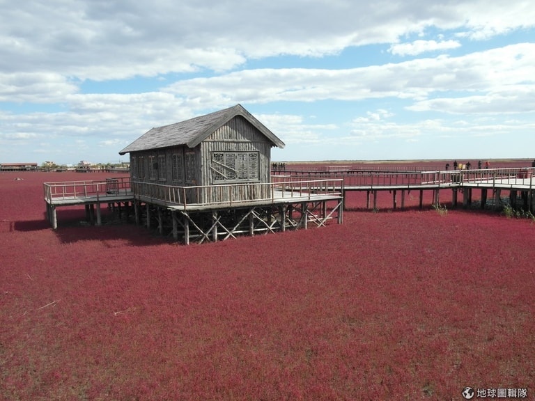 紅海灘(Red Beach)位於中國遼寧省盤錦(Panjin)市郊的遼河三角洲,因這片鹽鹼地上生長茂盛的紅色海藻而得名。到了秋天,這些海藻就會呈現鮮豔動人的大紅色,讓這裡看起來就像一片血色大海。