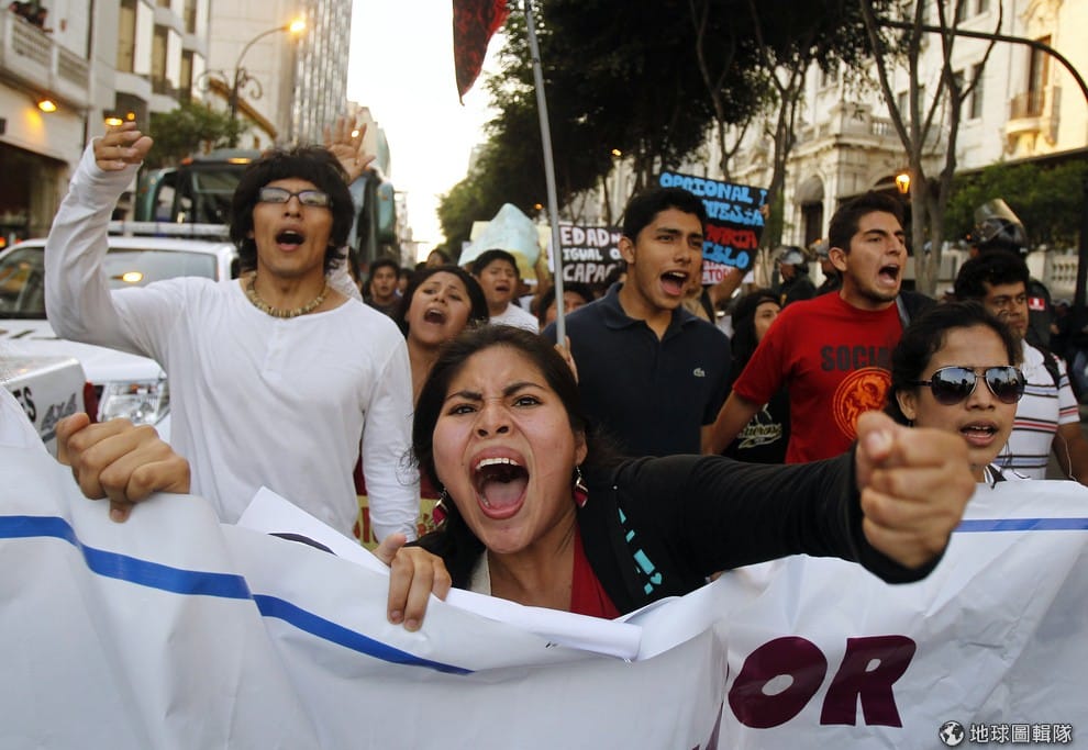 秘魯的年輕男女舉著標語大聲抗議影響他們權益的勞工法。