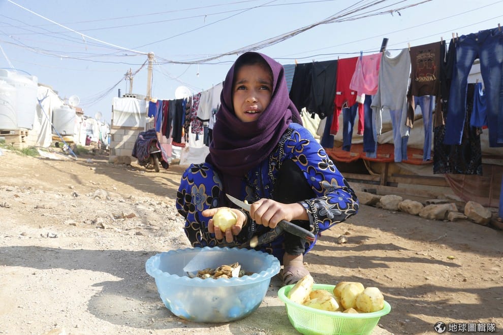 住在黎巴嫩的敘利亞難民小孩正在削馬鈴薯。