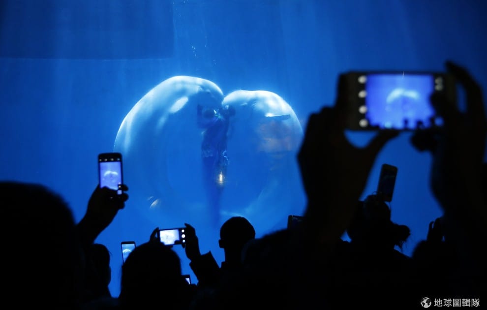 目前正在哈爾濱舉辦的國際冰雪節吸引大量遊客紛紛湧入哈爾濱,連帶位於哈爾濱北部的哈爾濱極地館也擠滿了遊客。遊客們正拿著相機對準水族箱裡的白鯨,牠正和訓練師上演一場名為「海洋之心」的表演秀。