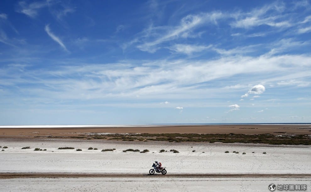 一名來自波蘭的機車騎士騎著KTM越野機車從維拉卡洛斯帕茲到聖胡安,這段路是達卡越野拉力賽( Dakar Rally )的第二階段。
