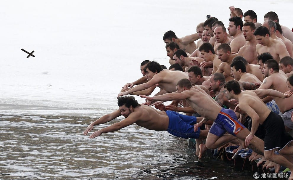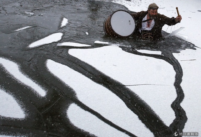 在卡洛費爾鎮,一名揹著鼓,拿著鼓棒的男子站在結冰的登薩河(Tundzha river)中破冰,在他面前有一群人正在載歌載舞慶祝主顯節。保加利亞習俗相信,破冰儀式能帶給人健康。