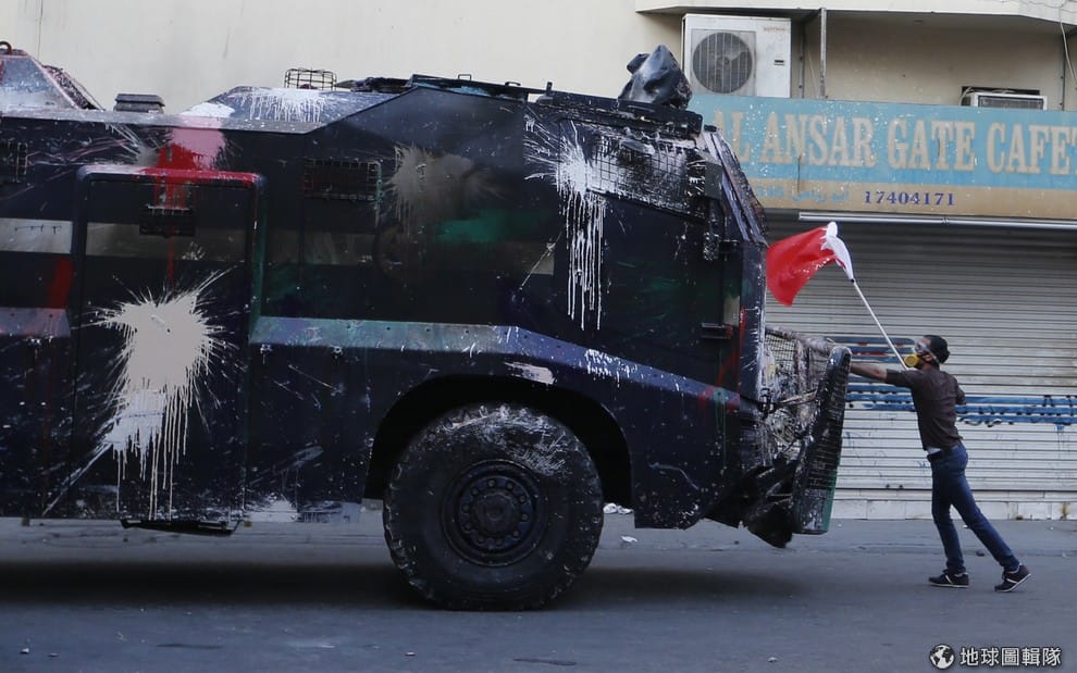 一名抗議者手持巴林國旗,站在裝甲車前防止鎮暴警察進入位於首都麥納麥南部的村落。巴林警察對著聚集在什葉派穆斯林反對派領導人薩曼( Sheikh Ali Salman)家外圍的抗議者發射橡皮子彈和催淚瓦斯。