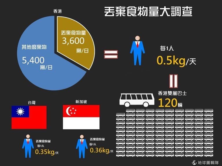有亞洲美食之都稱號的香港,現在卻同時有著「浪費食物之都」的負面印象。根據「地球之友」(Friends of the Earth)組織2011年的調查,香港每天約有3600噸廚餘產生,換算起來,等於每位港人每天會丟棄0.5kg的廚餘,超出台灣的廚餘量1.4倍!