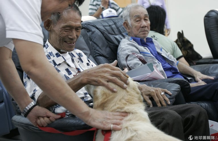 新加坡的安養中心內,老人家和到訪的狗狗開心互動。