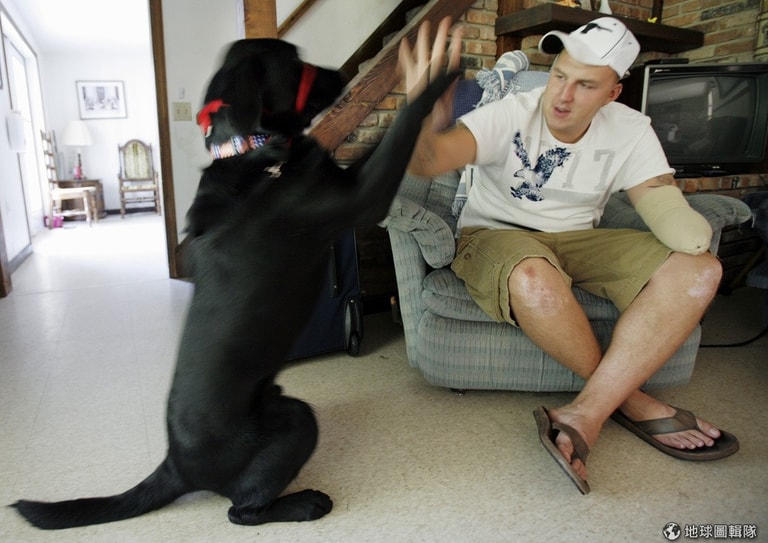 在阿富汗戰場上失去手臂的美國大兵喬,他和服務犬狗狗諾爾玩耍中。