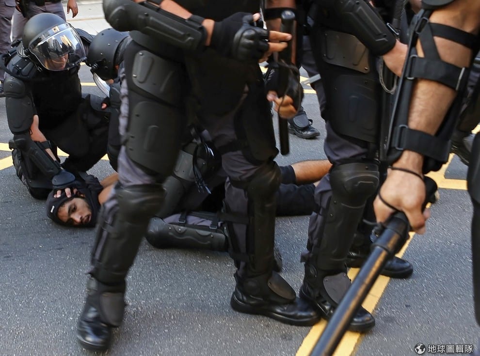 9號聖保羅抗議活動中,一名男子被鎮暴警察死死壓在地上。這場抗議活動起因於人民不滿大眾運輸工具票價調漲,政府因為舉辦巴西世足賽而排擠其他民生預算,讓當地民眾生活苦不堪言。