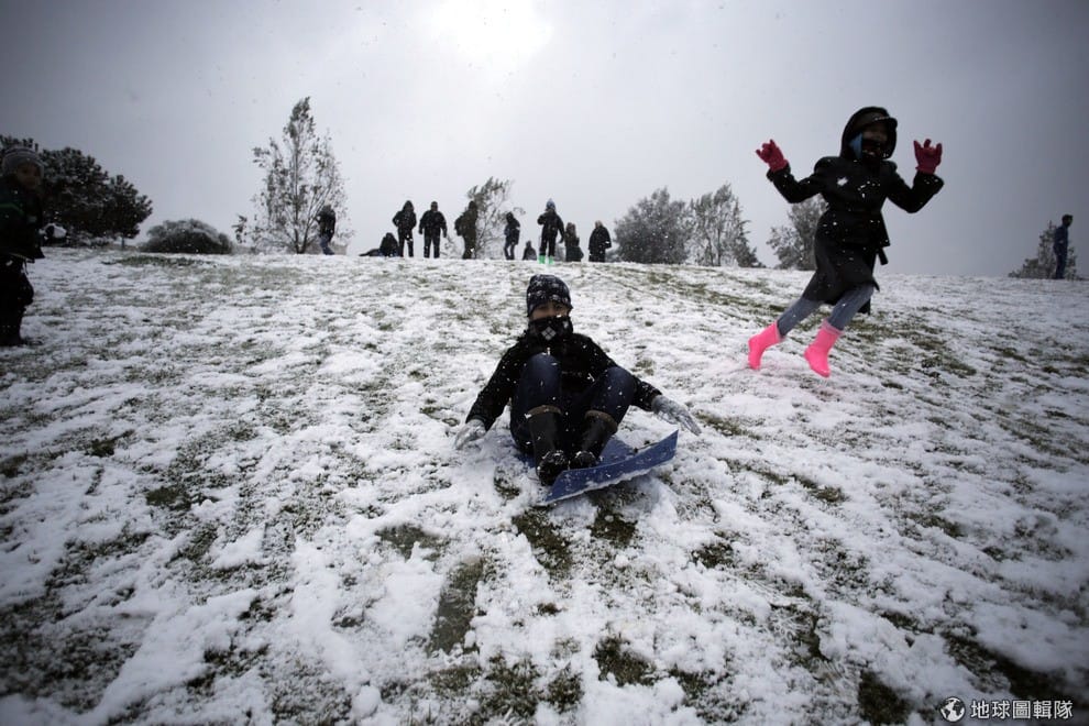 一名小男孩在耶路撒冷滑下積滿雪的山坡。時值暴風雪侵襲中東,黎巴嫩、敘利亞、土耳其、約旦、以色列和加薩走廊都有不少災情傳出。而敘利亞難民也煩惱簡陋的安置所能否抵擋得住暴雪與低溫。