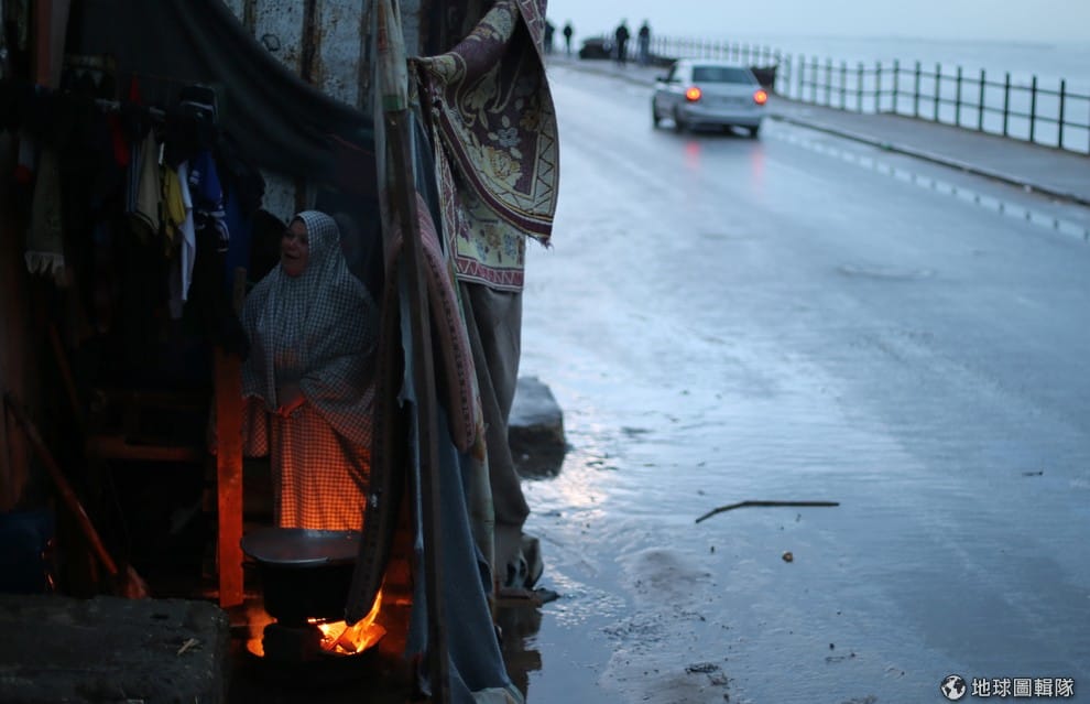 一名女子在位於加薩走廊的難民營中燒水,希望能夠讓簡陋的居所溫暖一點。目前,難民們最擔心的就是暴風雪和大雨,當地已經有不少建築物因為大雪的侵襲而不堪一擊。