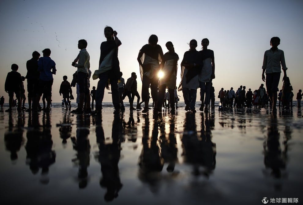 人們在孟買的海灘上散步,長長的海岸線外就是阿拉伯海。他們的倒影投射在海灘上,別有一番韻味。