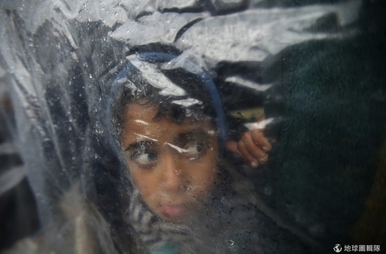 一名小男孩透過尼龍塑膠布向外看,他的家在去年夏天,被以色列持續50天的攻擊而搖搖欲墜,至今仍沒有修復。暴雨和接近零度的低溫對住在加薩走廊的巴勒斯坦難民來說,是嚴酷的挑戰。不少人住在聯合國的難民營中,希望能撐過這個冬天。目前,加薩地區每日只供電6小時。