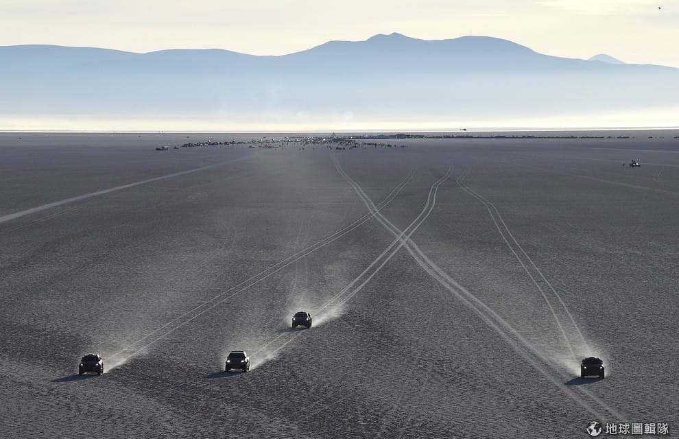 在達卡越野拉力賽(Dakar Rally)中,4部越野車同場競速,在沙地上留下長長的車痕。
