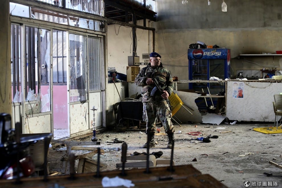 一名黎巴嫩軍人站在遭自殺炸彈攻擊的咖啡店內。10號晚間,兩名自殺炸彈客進入一間位於的黎波里(Tripoli)的咖啡館引爆炸彈,造成至少7人死亡,36人輕重傷。這場炸彈攻擊由蓋達組織的分支努斯拉陣線(Al-Nusra Front)策畫,目的是為了向黎巴嫩和敘利亞的遜尼派教徒報仇。