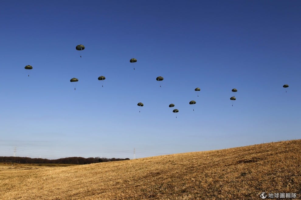 日本自衛隊傘兵部隊在東京東部船橋市習志野演習場展開一年一度的軍事演習,大約有500名軍人和24架軍機參加,模擬當有外敵入侵日本本島時,該如何及時反應。多名傘兵從軍機上跳下練習作戰。