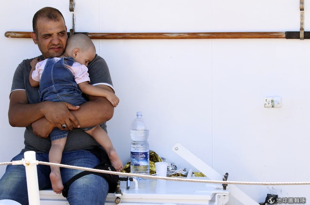 一位移民爸爸抱著小孩坐在船上,準備要從非洲偷渡到義大利。