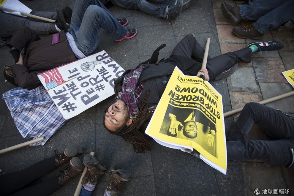 一名抗議警察暴力威脅少數族群的民眾躺在地上,參與名為「裝死示威」(Die-In)的抗議活動。15號是黑人民權鬥士馬丁‧路德‧金(Martin Luther King)的生日,紐約街頭出現示威活動。去年一連串警察對黑人使用暴力的事件發生,又挑起美國社會對種族議題的敏感神經。