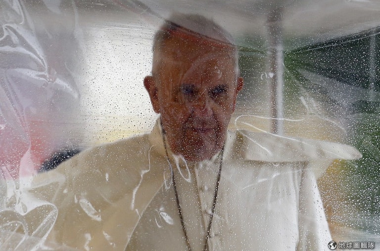 天主教教宗方濟各(Pope Francis)站在塑膠布後面。教宗方濟各在17號時抵達菲律賓,為死於海燕颱風的死者祈福,並撫慰在風災中活下來的家屬。前年,強颱海燕襲擊了菲律賓,造成6,300人死亡。