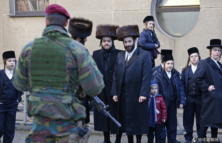 一名傘兵守在安特衛普市的猶太學校外面。比利時軍方加強首都布魯塞爾、安特衛普市公共場所以及猶太學校的保安。軍方派出150支部隊協助警察防衛。