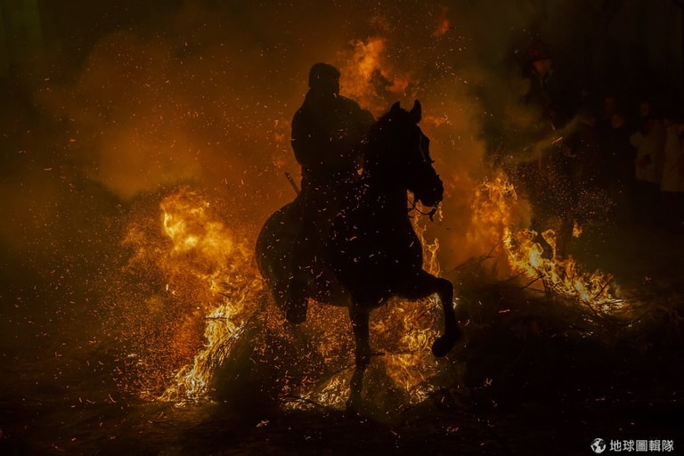 一名男人騎著馬跳過火焰。這一天是燈籠節(Luminarias),也就是西班牙聖安東尼節(Saint Anthony's)的前一天。聖安東尼被認為是動物的守護神,為了守護動物,聖巴爾托洛梅德皮納雷斯村在16號這天會舉行一個從500年前傳下來的傳統活動,人們騎著馬穿過小村莊裡狹窄的鵝卵石街道,再跳過營火,好用營火的煙淨化動物。