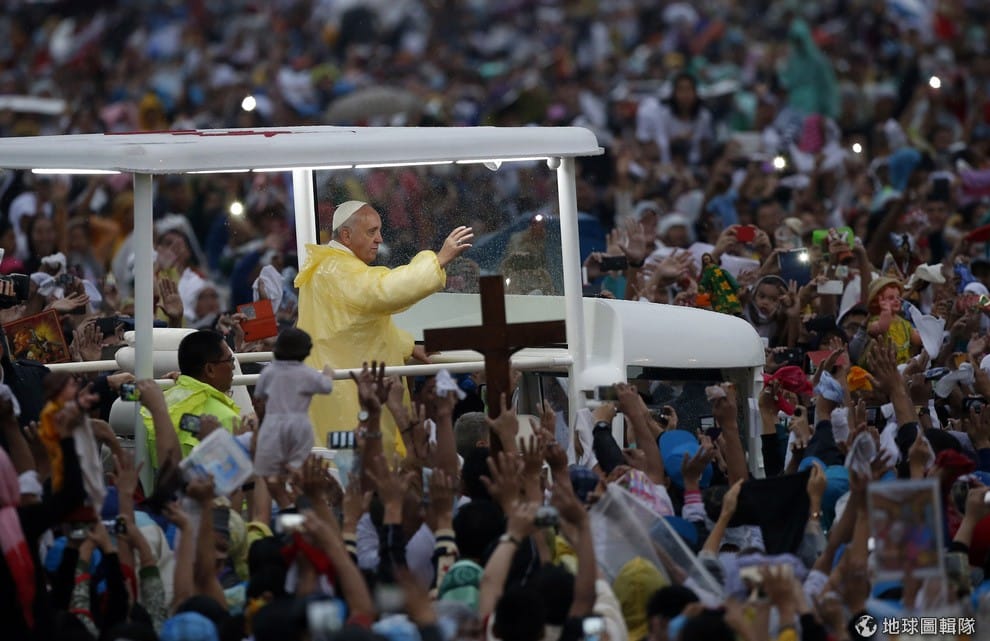 照片中的教宗方濟各(Pope Francis)站在車上向群眾揮手致意,他剛剛結束了在馬尼拉黎剎公園(Rizal Park)舉辦的彌撒。