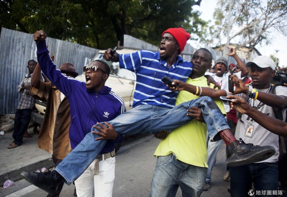 受傷的示威民眾被其他人抬到路旁,18號這天,海地出現要求總統重組國會的示威群眾。