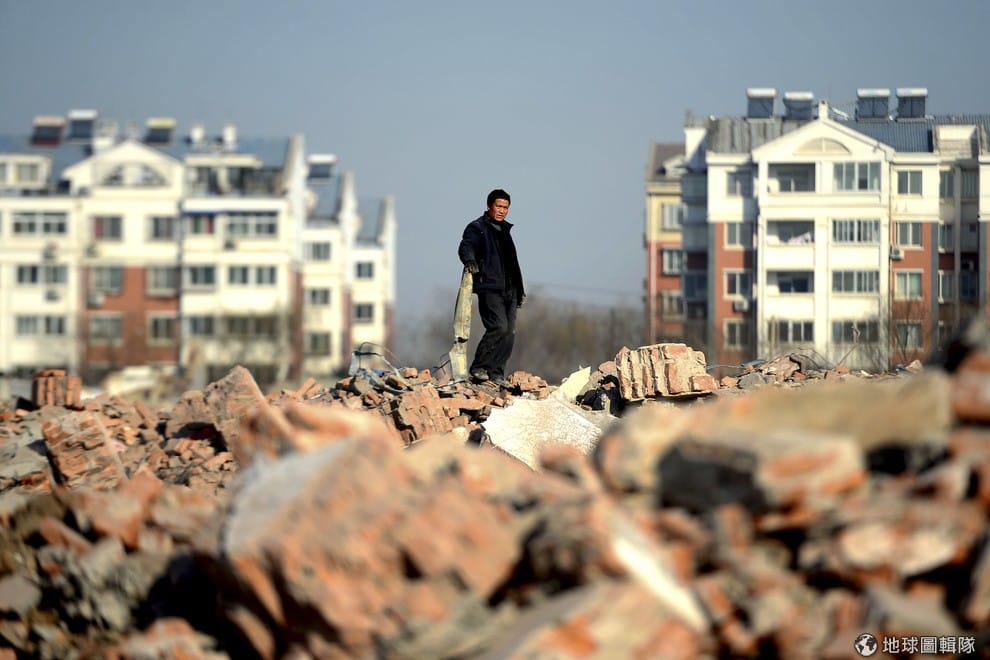 正在磚瓦中找尋回收物的男子望向攝影師。中國房市供過於求造成房價滑落,過去4個月來房價出現連續下滑的現象。