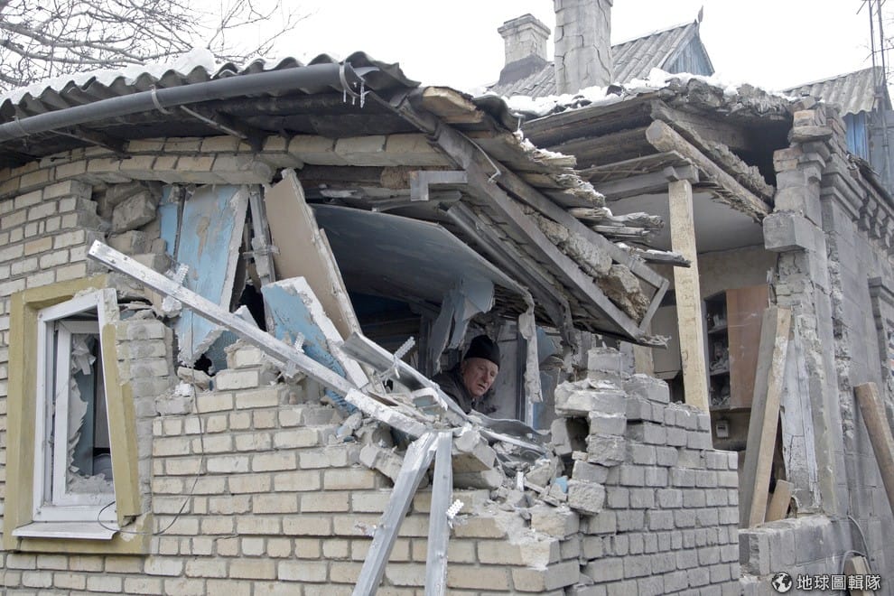 民眾站在自家內,無奈地看著自家房子被戰火波及頹圮,烏克蘭東部近期再度因為反政府民兵和政府軍交戰,造成財物損失以及民眾死傷。