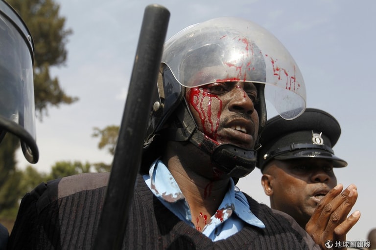 肯亞的警察臉上滿是鮮血,他和其他人正在示威現場面對抗議群眾。