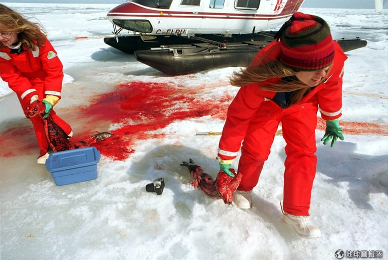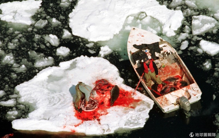 加拿大當地的獵捕海豹船隻,船上滿是流出鮮血的海豹屍體,冰面上的獵人正拿著木棒朝海豹頭部重重的打下去...。圖片來源:Darren McCollester/Newsmakers