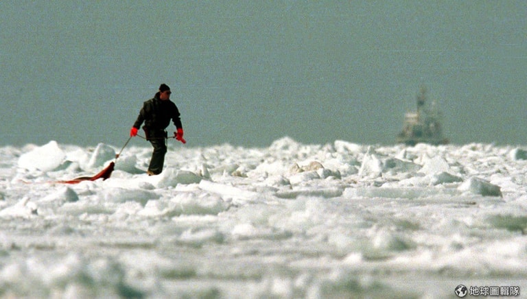 海豹獵人正拖著海豹的屍骸走過冰面。圖片來源:Darren McCollester/Newsmakers