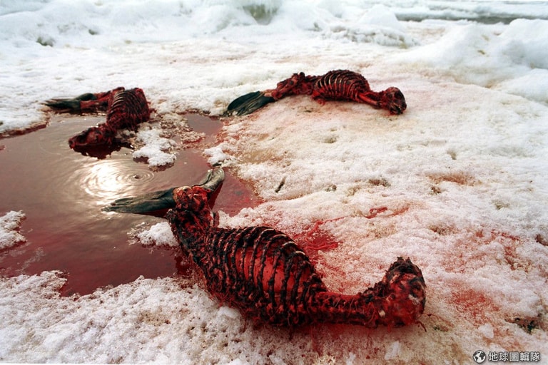 皮被剝下後的海豹屍骸就被丟在冰面上,滿滿的鮮血讓白色的冰面都快看不見了...。圖片來源:Darren McCollester/Newsmakers