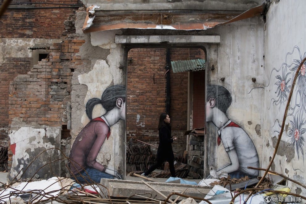 上海市區內,一名女性走過畫有塗鴉的老房子區。