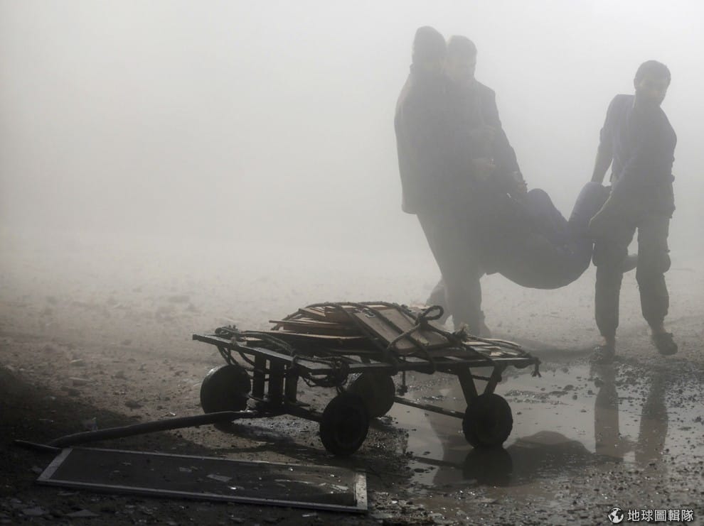 大馬士革城郊再度受到政府軍空襲,照片中的居民忙著把傷患移到安全的地方。